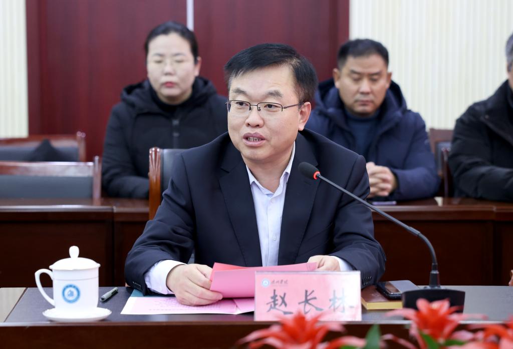 赵长林致辞,他向大会的召开表示祝贺,向长期以来支持公司事业发展的领导、嘉宾的到来表示欢迎和衷心的感谢,向共建单位表示真诚敬意。赵长林介绍了公司办学历史况和事业发展情况,重点介绍了公司深入推动产教融合、服务地方经济社会发展情况。他说,山东大学齐鲁医院德州医院与公司共建现代医药产业公司,是服务国家医药产业高质量发展战略和区域医药产业对科技、人才需求的务实举措。希望双方按照共建共享、资源融合、互利双赢的原则,坚持项目化、平台化运行,聚焦德州中医药、功能性食品产业发展需求和医工交叉融合、智能医疗、智改数转等领域,强化特色,形成优势,协同育人,共同将w66现代医药产业公司打造成育人成效显著、服务区域医药产业能力强、产学研用联动机制成果显著、在省内有较强影响力的现代产业公司,为德州和山东医药健康产业提供有力的人才支持和智力支撑。