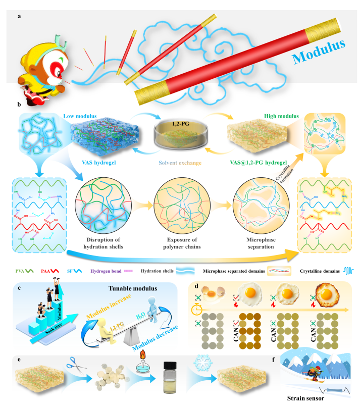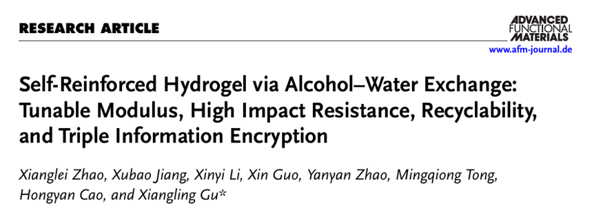 近日,该团队提出了一种“醇析效应”的新思路,通过醇-水置换制备了自增强水凝胶,实现了水凝胶新材料的模量可调、高抗冲、可回收以及三重信息加密。将水凝胶浸泡于1,2-丙二醇(1,2-PG)中,调控浸泡时间实现了模量从kPaMPa的精准调节。通过溶剂置换诱导聚合物链形成纳米级微晶域和多重氢键网络,有效增强了材料的力学性能。置换后的水凝胶展现出卓越的强韧性与抗冲击性能以及优异的抗冻性。此外,所设计的材料可实现模量的“高-低”循环调控,具有良好的可回收性能,契合绿色材料的设计理念。研究团队使用硝酸铈铵溶液,开发了时间/紫外/温度三重响应的集成防伪新方法,用于动态信息隐藏与“阅后即焚”式加密显示。该工作以公司与济南大学联合培养硕士研究生赵相磊作为第一作者,顾相伶教授为通讯作者,1027日以“Self-Reinforced Hydrogel via Alcohol-Water Exchange: Tunable Modulus, High Impact Resistance, Recyclability, and Triple Information Encryption”为题在线发表(Xiangling Gu*, et al, Adv. Funct. Mate., 2025, e23269)。