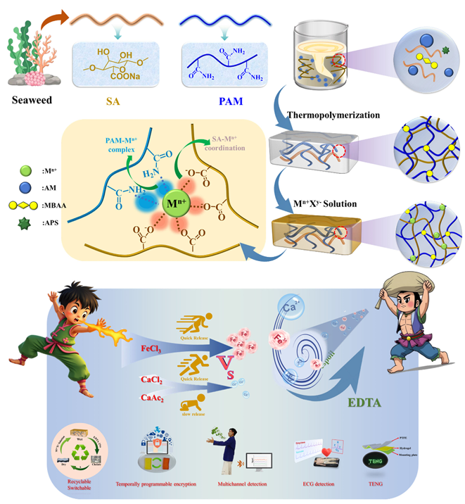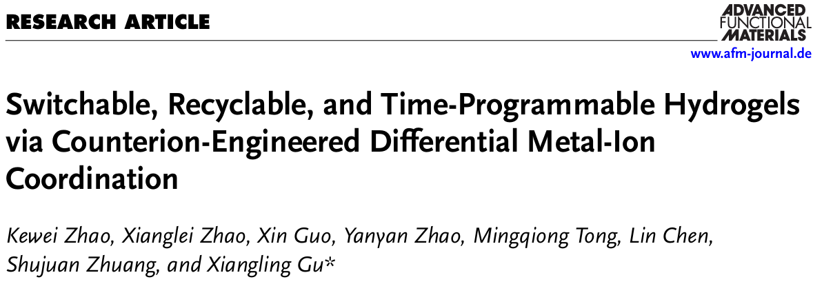 该团队基于抗衡离子调控策略开发出集功能切换、绿色回收与动态加密于一体的多功能水凝胶。首先设计了海藻酸钠-聚丙烯酰胺双网络结构,引入抗衡离子(Cl⁻/Ac⁻)调控金属离子(Fe³⁺/Ca²⁺)的配位行为。研究结果表明,高电荷密度的Fe³⁺可形成强配位网络,而Ca²⁺的配位动力学则显著受抗衡离子影响:Cl⁻促进快速交联形成致密界面,Ac⁻则实现可控释放构建均匀网络。这一发现突破了传统研究仅关注金属离子属性的局限,为水凝胶性能的精准调控提供了新思路。该成果以公司与山东理工大学联合培养硕士研究生赵可伟作为第一作者,顾相伶教授为通讯作者,Switchable, Recyclable, and Time-Programmable Hydrogels via Counterion-Engineered Differential Metal-Ion Coordination”为题,于87日在线发表(Xiangling Gu*, et al, Adv. Funct. Mate., 2025, e14481)。