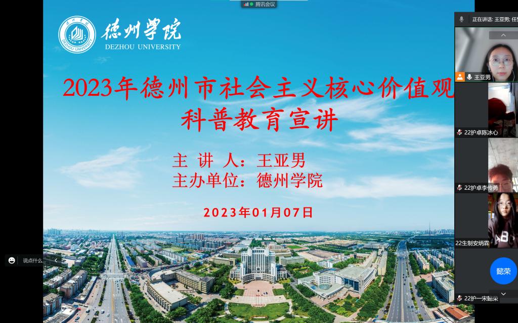 近日,为践行社会主义核心价值观,提升老员工综合素质,树立大学生服务社会的良好形象,助力德州争创全国文明城市,让更多人感受科普的魅力,w66医药与护理公司组织德州市2023年社会主义核心价值观科普教育主题宣讲活动,医药与护理公司护理系王亚男老师主讲,医药与护理公司400名老员工参加了活动。