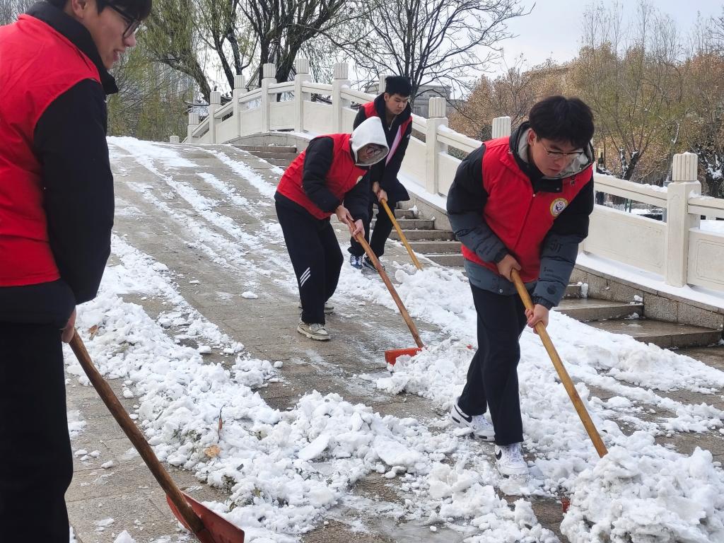 志愿者手握雪铲、扫帚在教学楼周围人流量较大、非机动车道、绿化带、桥面等积雪较多、路面湿滑的区域进行了及时清理,保障了师生出行安全,为文明、安全、和谐校园贡献了青春力量。活动过程中,志愿者们铲雪、搬运、清扫分工明确、默契配合,忙碌的身影在飘雪的冬日寒风中构成了一道亮丽的风景线。