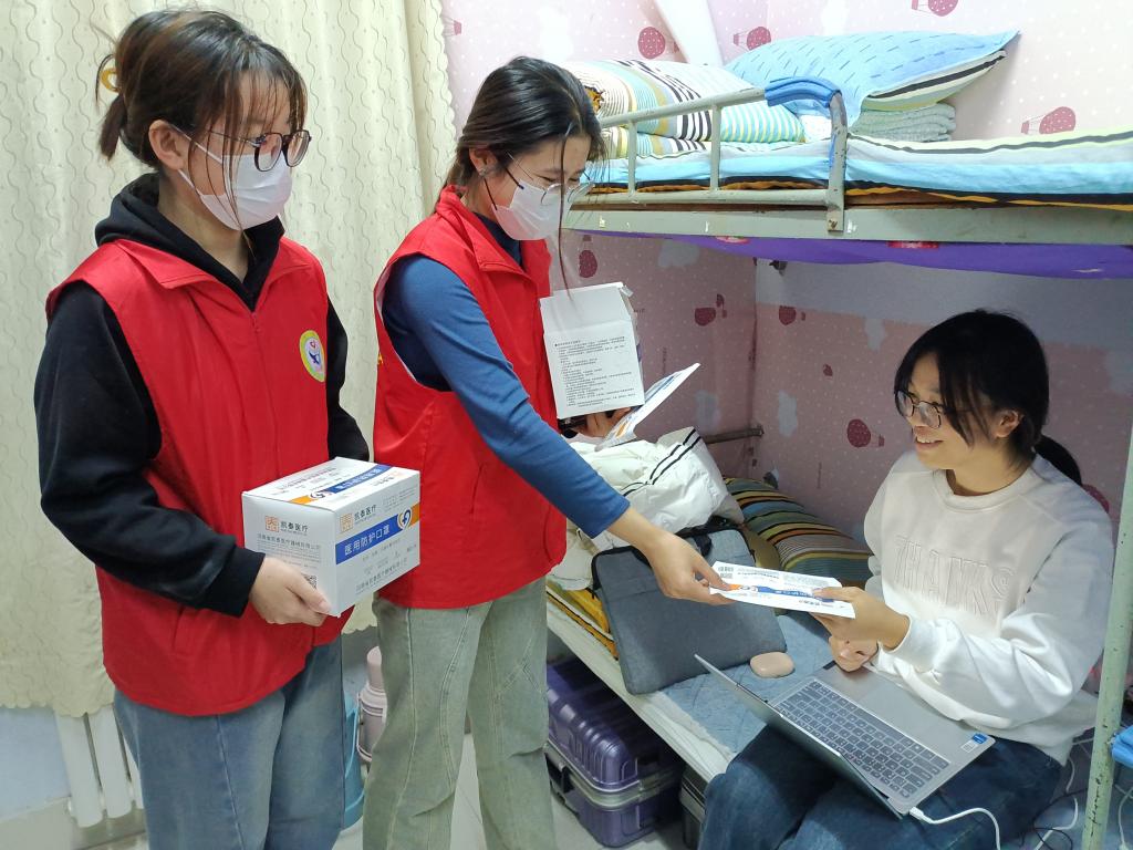 活动伊始,志愿者提前到达员工宿舍楼,准备物资分发任务。随后成员们有序分散到各个宿舍为同学们发放口罩,并讲解正确佩戴口罩的方法。在发放口罩的过程中,志愿者高度负责,积极关心同学们的身体情况,提醒冬季流感预防的健康常识,平时要养成良好的生活习惯,做好日常防护,佩戴好口罩,宿舍内做到常消毒,勤通风。