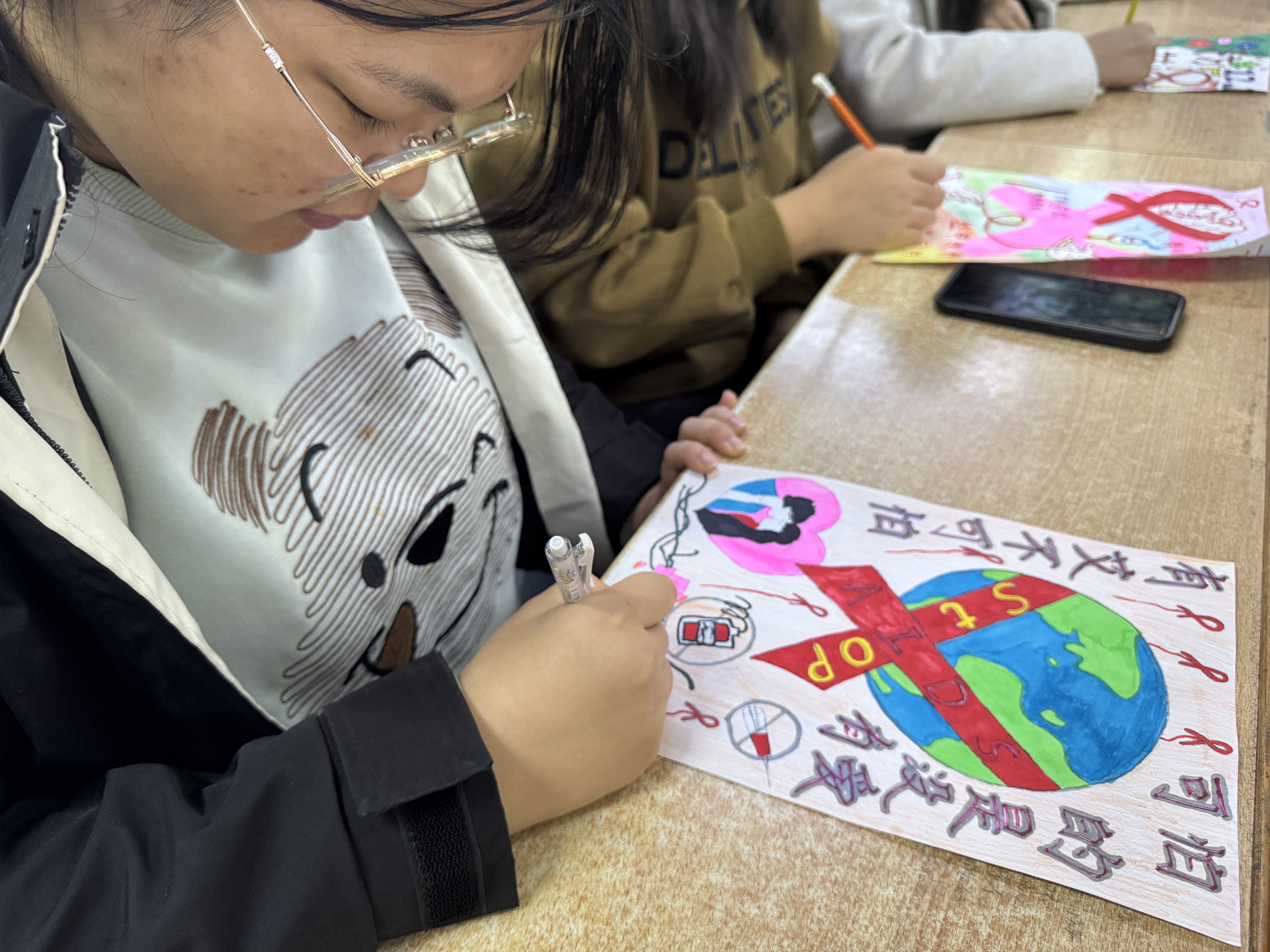 活动伊始,主讲人从艾滋病的传播途径讲起,分析了每一种传播途径在不同场景下可能存在的风险。例如在性传播部分,详细指出不安全性行为的危害,强调了固定性伴侣以及采取保护措施的重要性。在谈到血液传播时,特别提醒同学们远离非法采血点,谨慎对待纹身、穿耳洞等行为。而对于母婴传播,则讲解了现代医学干预的成功案例和重要意义。随后,主讲人结合实际案例,重点讲解了老员工在日常生活和学习中如何避免感染艾滋病。同时,为了加深同学们对艾滋病相关知识的理解,讲座现场播放了关于抗“艾”的宣传视频,让同学们更加直观地了解到艾滋病的危害性和预防措施。最后,同学们制作了关于抗“艾”的手抄报,用画笔勾勒防“艾”重点、书写防治知识,让同学更加了解艾滋病。