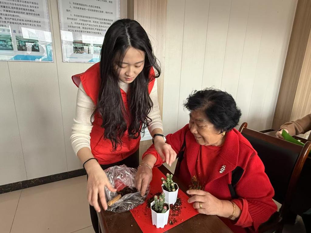 活动现场,志愿者们提前备齐植树所需工具,以及多肉植物苗、花盆、营养土等材料,全力营造温馨且有序的种植氛围。活动正式开始,志愿者先向老人们展示正确的松土、栽种多肉植物方法,并详细讲解日常养护技巧,从光照、浇水到施肥,每个步骤都讲解得细致入微。老人们热情高涨,精心挑选心仪的多肉品种,有的还与邻座老人交流种植心得,现场气氛热烈融洽。在种植过程中,大家不仅享受动手植绿的乐趣,还分享各自的植物故事,欢声笑语在社区四处回荡。一番忙碌后,每位参与者都成功种出属于自己的多肉小盆栽。他们满意地捧着作品,脸上洋溢着幸福笑容。