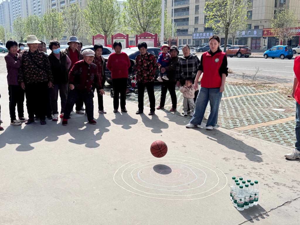 本次活动设置八段锦、沙包投掷、趣味保龄球等项目,集养生性、趣味性、竞技性于一体。活动伊始,志愿者与社区老人共同开展八段锦热身运动。为确保每位老人准确掌握动作要领,志愿者将八段锦动作细致分解,穿梭于老人之间,手把手指导每个动作,助力老人领悟动作精髓,感受传统养生文化的魅力。紧接着的投掷沙包环节中,老人们在画有同心圆的场地上,站在指定线外专注投掷,依据沙包落点计分,有效锻炼了肢体协调性与精准度;随后的趣味保龄球项目妙趣横生,以塑料瓶替代传统球瓶,老人们通过滚动皮球击打“球瓶”,在简单规则中收获欢乐、活动身体;最后的 “钓鱼” 活动中,老人们手持绑有绳子的木杆,通过旋转将绳子另一端的瓶子卷至脚下,现场气氛热烈,大家相互鼓劲,共同享受成功的喜悦。