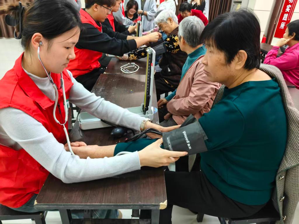 活动围绕疾病预防宣讲与健康助诊两大环节展开,全程贯穿党性教育和为民服务的根本宗旨。活动伊始,志愿者通过发放宣传手册、现场答疑等方式,向社区老人系统讲解了流感、肺炎等冬季常见传染病的防治知识,并传授科学预防技能,帮助老人筑牢健康防护屏障。在健康服务环节,志愿者为老人提供免费血压、血糖测量服务,结合专业所学,针对不同健康状况提出个性化建议,引导老人养成健康生活方式。在此过程中,同学们不仅实现了专业知识向实践服务的有效转化,更在面对面服务中深化了对“医者仁心”的理解,践行了党员的责任与担当。
