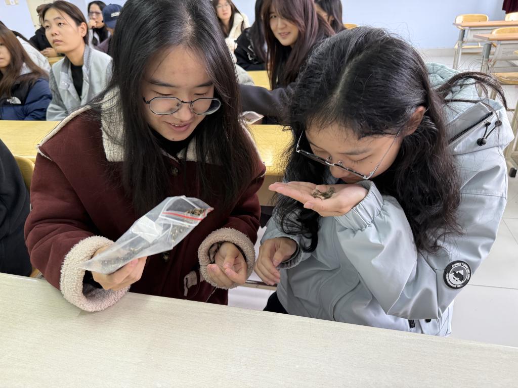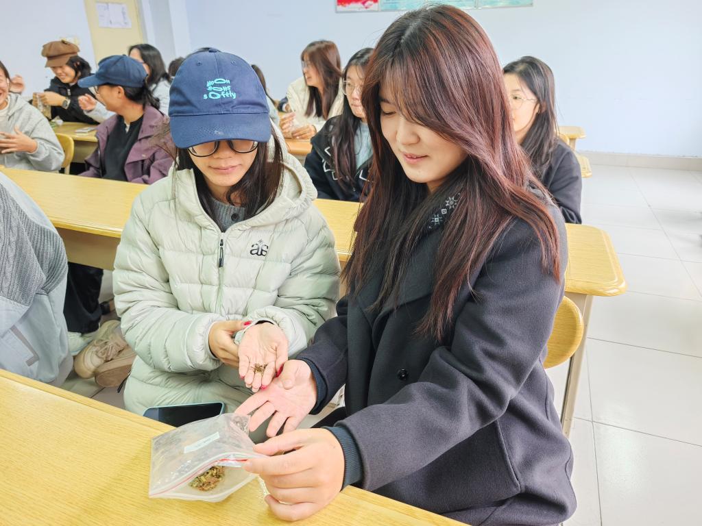 活动伊始,主讲人以中医药材为切入点,紧扣主讲解中医药文化在调节老员工身心健康、提升免疫力等方面的独特价值,激发同学们对中医药文化的兴趣。随后,主讲人通过“实物展示+知识科普”的形式,现场分发艾草、枸杞、山楂等药材标本,结合性质、气味与养生功效,生动呈现了中医药"治未病"的智慧。同时致讲解中医药在日常健康管理中的多元应用场景,让同学们切实体会传统药的实用价值。现场互动环节中,同学们通过观察药材形态、闻辨药香,切身感受到传统医药的实用性与科学性。活动结束后,同学们纷纷感悟,这次活动加深自己对中医药材形态特征与文化内涵的认知,进一步激发对传统医药文化的探索欲。