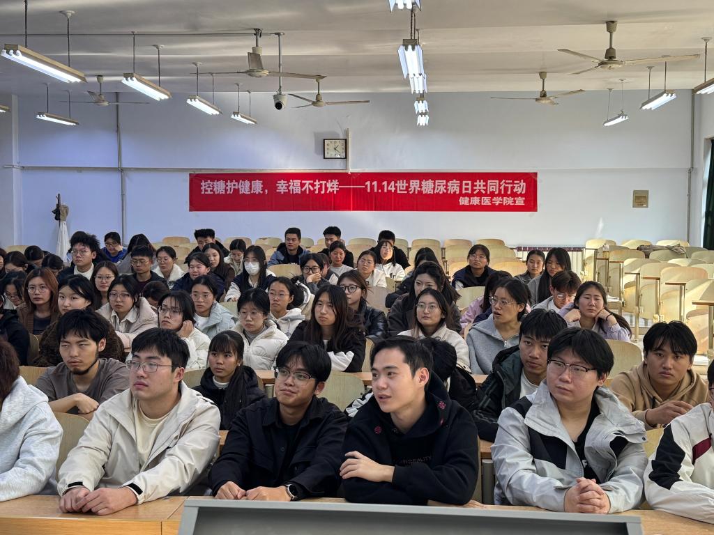 讲座伊始,滕老师从专业角度解析了糖尿病的定义、发病机制及流行趋势。特别强调,近年来糖尿病呈现年轻化趋势,老员工群体因熬夜、缺乏运动、高糖饮食等不良生活习惯,已成为糖尿病的高危人群。通过展示真实的临床案例,讲解了糖尿病视网膜病变、糖尿病肾病等并发症的危害,让同学们深刻认识到科学控糖的重要性。