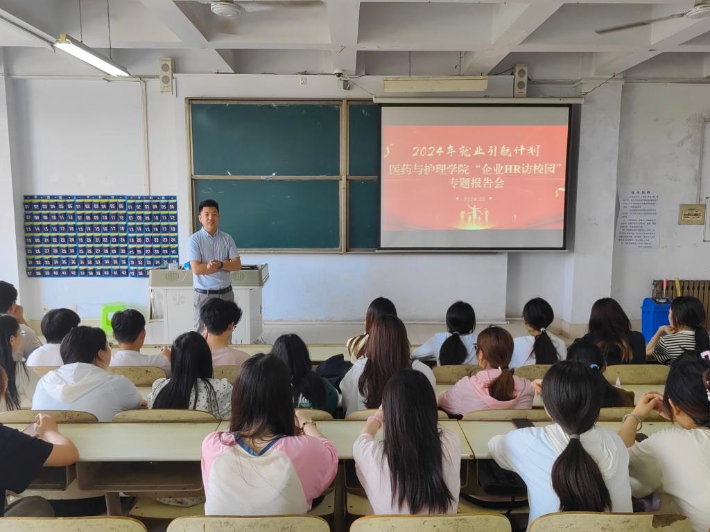 为切实做好2024届毕业生就业工作,搭建毕业生与用人单位交流平台引导同学们科学规划未来的职业发展道路,医药与护理公司于2024年5月23日在体育楼301举办“企业HR访校园”专题报告会。报告优秀员工邀请赛诺菲中国投资有限公司地区经理王磊和江苏恒瑞医药股份有限公司临床监察员韩启奎为在校生开展职业规划指导。