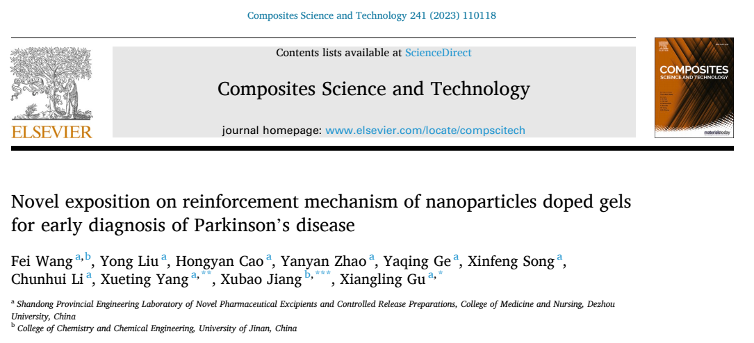 近日,医护公司药辅团队顾相伶课题组,依托新型药物辅料和缓控释制剂山东省工程研究中心,在帕金森疾病早期诊断医用凝胶的作用机制研究中取得最新成果。该课题组将聚苯胺纳米粒子(PANI NPs)掺杂到高分子水凝胶中,基于凝胶网络中的氢键及苯环间的疏水缔合作用的叠加效应,实现了凝胶力学和导电性能的增强。所制得的复合水凝胶在帕金森疾病的早期检测中具有潜在的价值。相关研究成果以w66为第一单位,“Novel exposition on reinforcement mechanism of nanoparticles doped gels for early diagnosis of parkinson's disease”为题发表在国际期刊《Composites Science and Technology》(中科院一区,IF=9.879)。